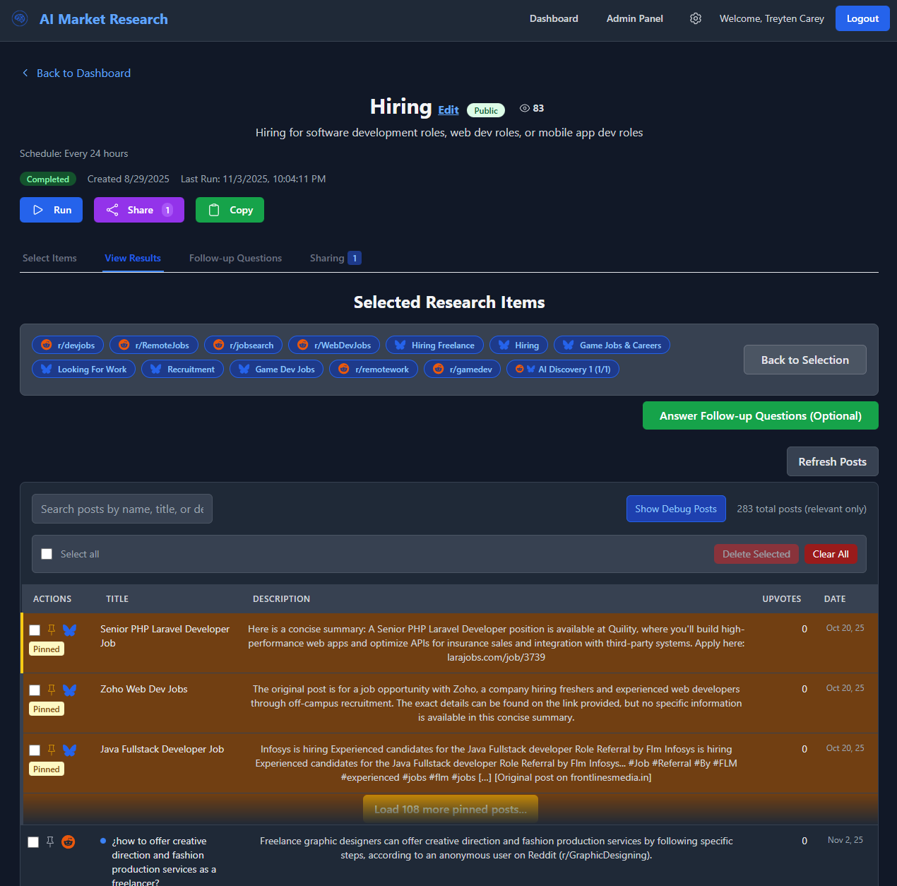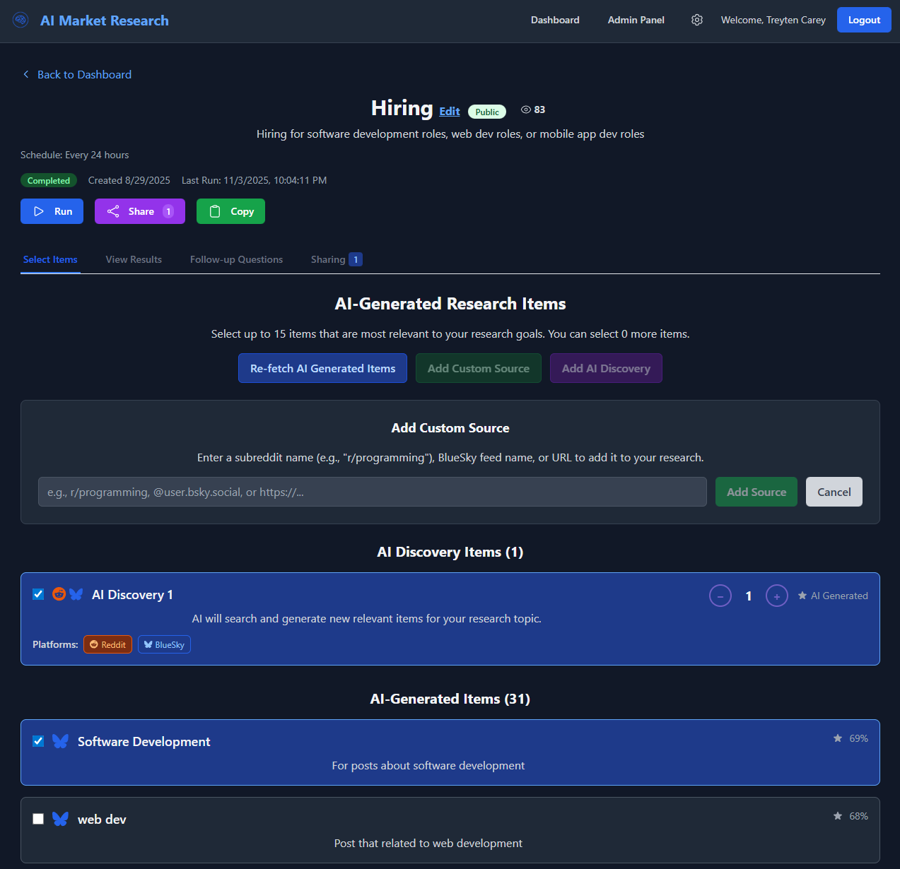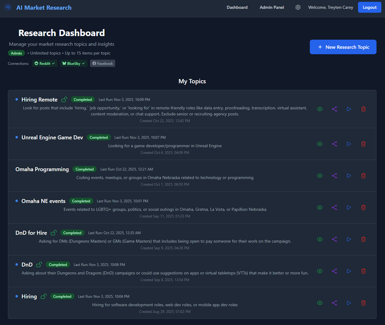 An AI-driven market research tool for analyzing topics. Create your account, create a topic, have AI analyze your topic, and receive daily notifications of new information related to your topic. Share your data with other accounts or make your topic public for anyone to access.